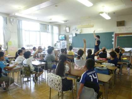 先生の特技や好きなもの、苦手なものを三択にして、楽しいクイズを考えてくれました。教室では手を挙げて参加。正解が流れると、