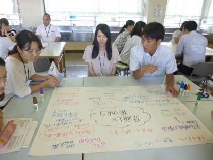 後半は、国語の「書く」指導の充実を図るための手立てについて、「ワールドカフェ」という手法を使ってグループごとに話し合いを行いました。