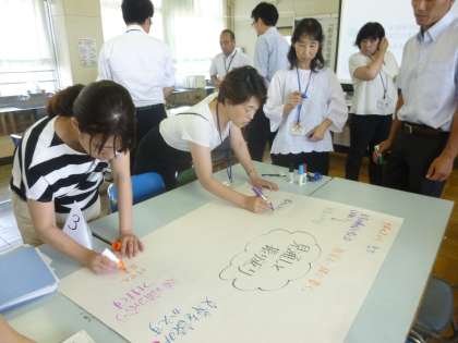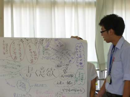 「書く意欲を高める指導」「見通しと振り返りの指導の充実」「語彙を豊かにする指導」「自分の考えをもたせる指導の充実」「読書指導の推進」の5つのテーマをもとに、それぞれの教員が自分の実践やアイデアを出し合い、模造紙に書き込みます。5つのテーマすべてを時間を区切って回り、全員が考えを出し合います。そして、最後に発表を行いました。
