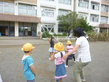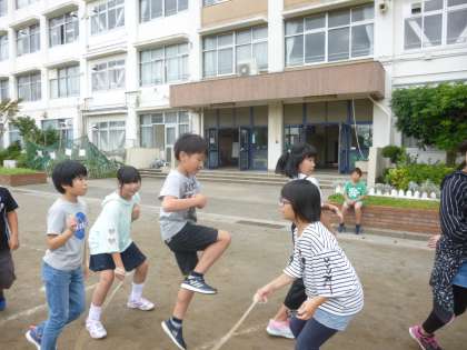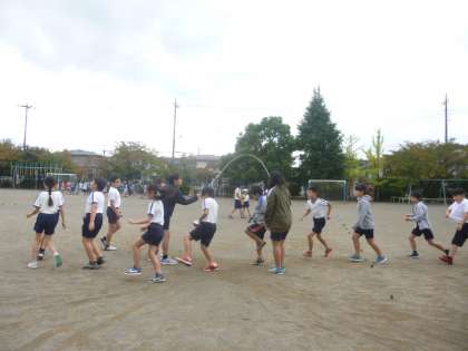 1年生は小学校に入って初めて大縄を跳ぶ子もいましたが、先生にタイミングを教えてもらいながら8の字跳びに挑戦していました。