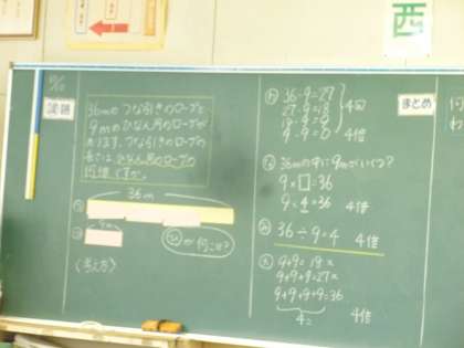「かけ算の筆算」の13時間目。今日は「何倍かを求める計算の仕方」を考えました。前時で、「○cmの▲倍」を求める計算について考えました。今日は、「○cmは□cmの何倍でしょうか」という問題を考えます。