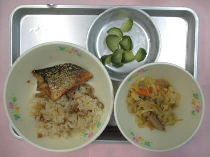 八王子しょうがごはん、さばのごま風味焼き、野菜のみそ炒め、きゅうりの塩漬け、牛乳