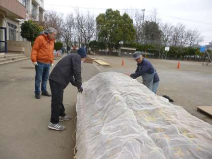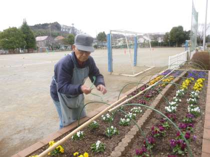 寒気の影響により、明日の昼頃から雪が降り始めるとの天気予報です。このニュースを聞いて、地域の中島さんが駆けつけ、花壇のお花に雪よけのカバーを付けてくださいました。外に出ていたプランターのお花も、玄関やひさしの中に避難させて雪の被害を受けないようにしてくださいました。放課後子どもの準備をしていた地域の方も、一緒にお手伝いしてくださいました。