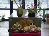 今日はひな祭り。桃の節句です。東昇降口には親王雛と花が飾ってあります。