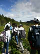 ネイチャーガイドさんのお話を聞きながら、気持ちよく木道を歩いています。