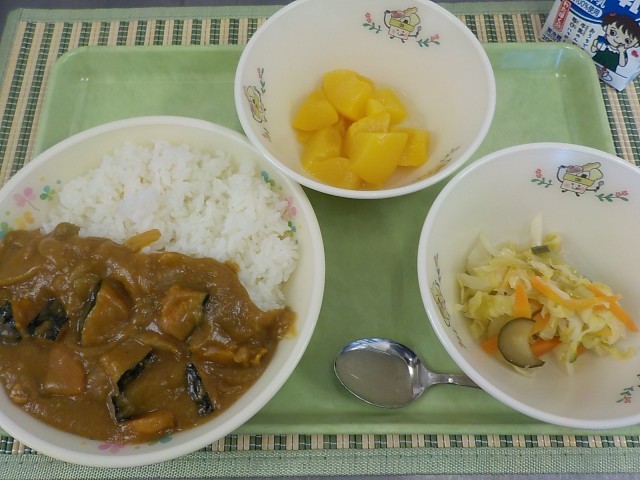 今日は学校給食畑で収穫されたかぼちゃを素揚げしてカレーに入れた 有機かぼちゃのカレーライスです。