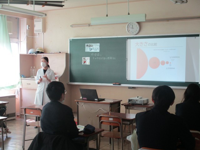 中学部3年生の保健体育の授業で、養護教諭が感染症防止の授業を行いました。細菌やウィルスが引き起こす病気や感染経路なども詳しく教えてくれました。また、性感染症についての知識や予防法についても知る大切な内容の授業でした。