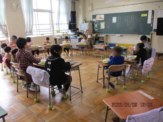 1年生のはじめての給食。みんな美味しそうに食べていました。
