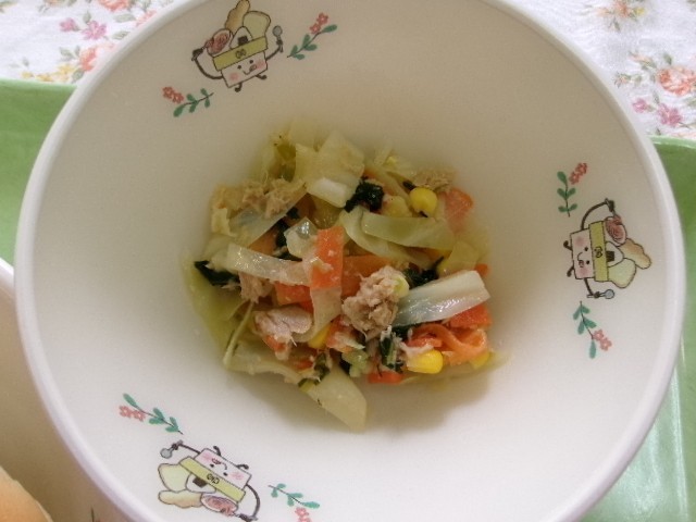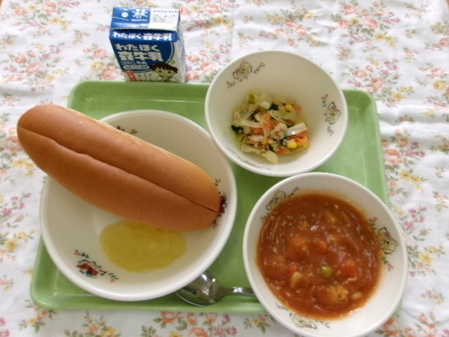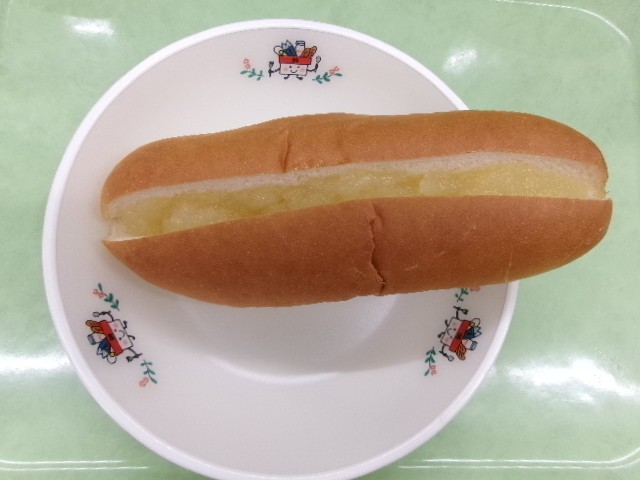 13日の給食は、ミルクパン、ポークビーンズ、ツナサラダ、りんごジャム、牛乳です。リンゴジャムはリンゴ缶詰を使って作りました。パンにはさんで食べることができるようにパンには、切込みが入っています。ジャムをはさむと写真のようになります。ポークビーンズをはさんで食べる子もいました。
