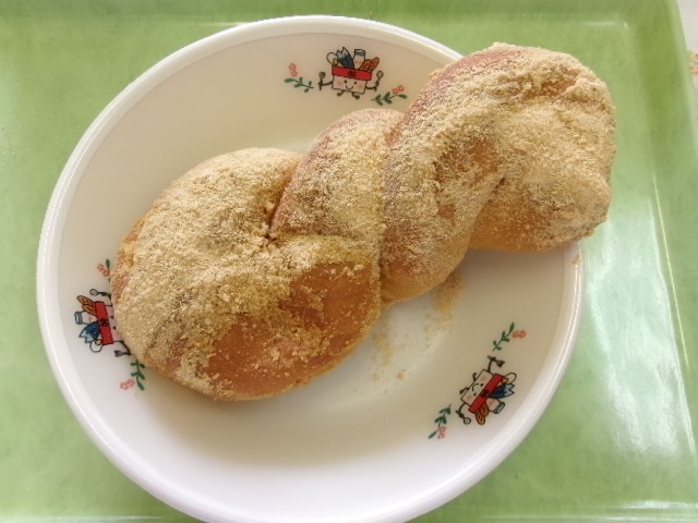 20日の給食は、きなこ揚げパン、白菜のクリームスープ、カリカリじゃこサラダ、牛乳です。きなこ揚げパンには、ねじりパンを使いました。きなこがよりパンにつきやすく、ちぎりやすいです。あるクラスで「きなこ」の秘密を話しました。きなこの中には、砂糖とちょっぴりの塩が入っているんだよと伝えると「え~!」と驚いていました。甘いものの中に少量の塩味を加えることで、甘みをより引き立たせてくれますし、コクや深みが増して美味しくなります。スイカに塩をかけたり、塩キャラメルなどが良い例かもしれません。ある男の子が「ザラメの揚げパン食べたいな」とリクエストしてくれました。