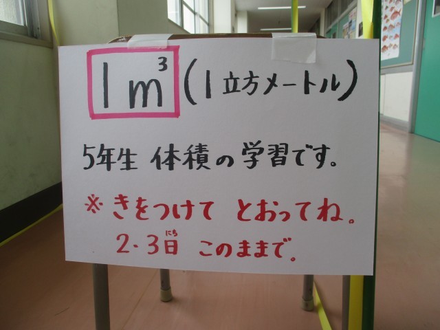 小学部5年生の学習で立方体の実際の大きさの模型が廊下に置いてあります。教室内だけでなく様々な場所を利用して分かりやすい学習を進めています。