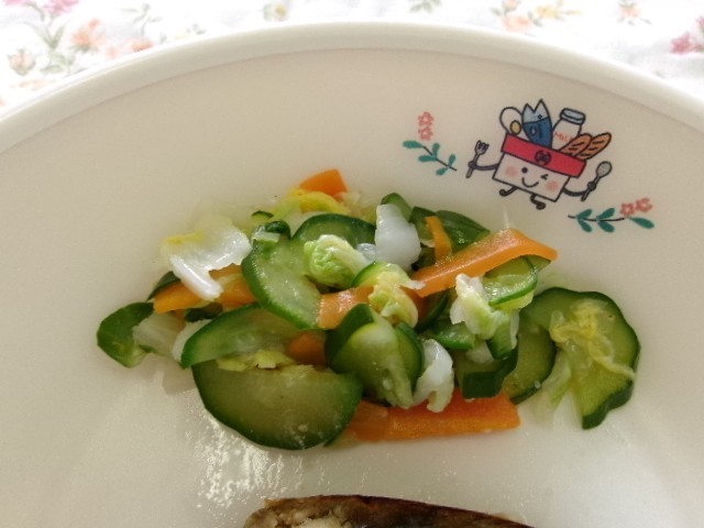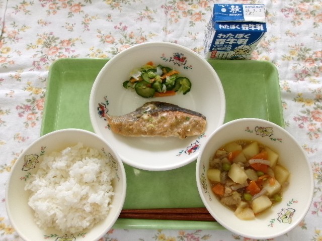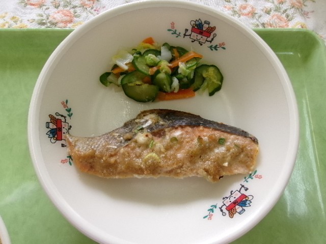 24日の給食は、ごはん、鮭のごまみそ焼き、新たまねぎの肉じゃが、浅漬け、牛乳です。八王子にある「塩を作っている会社」から「だし塩」を八王子市小中学校、義務教育学校へいただきました。かつおぶしや昆布のうまみがつまった「だし塩」を浅漬けに使わせていただきました。「だしのうまみ」があると、塩の量を減らしてもおいしく作れるのです。「だしのうまみたっぷり」の浅漬けをおいしくいただきました。