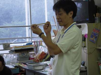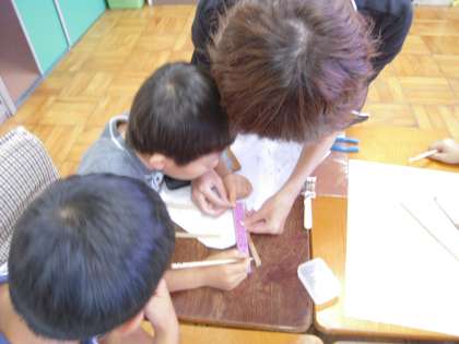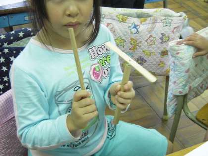 2年生は「ギリガリ」という棒に羽根をつけて竹とんぼのような物を作ります。そして、もつところの棒に切り込みを入れてこすります。こする振動で羽根が回るという仕組みです。なかなか回すのは難しかったようです。