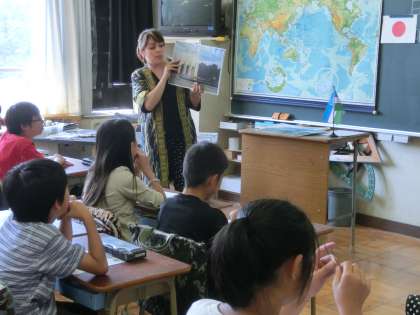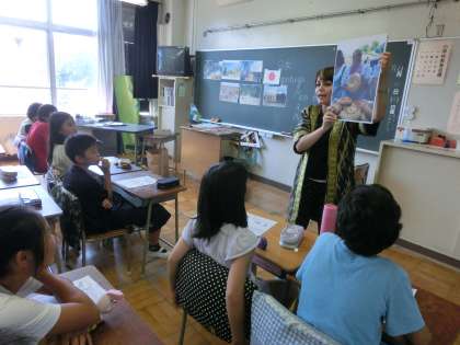 今回、5、6年生に授業をして下さったのは、日本の「源氏物語」を研究するためにウズベキスタンから来日した留学生の方でした。ウズベキスタンの風景や生活習慣をお話の中には、意外にも日本と似ている点が多くあるとの紹介がありました。