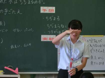 水は、空気と同じようにおし縮めることができるか、予想を立て、実験を通して明らかにしていきました。子供たちも集中して授業に取り組み、理科の楽しさを十分に味わった一時間になりました。