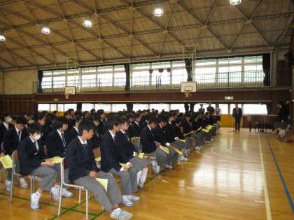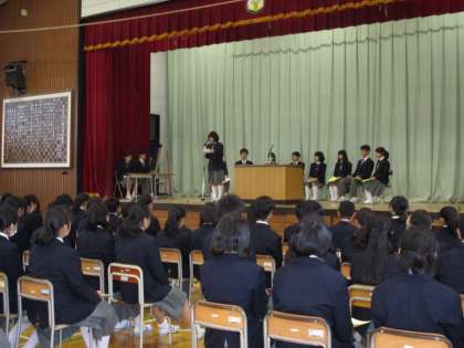 本日6校時、本校舎体育館において「生徒総会」が行われました。今日まで、各委員会、各クラスで、生徒全員にとってのよき学校をつくるために話し合いをしてきました。中学生らしい厳粛な雰囲気の中、活動内容を発表する委員長、質問をする生徒、聞いている生徒共に立派な態度でした。