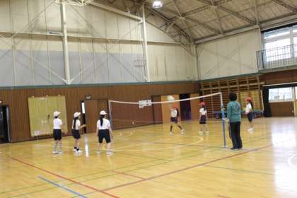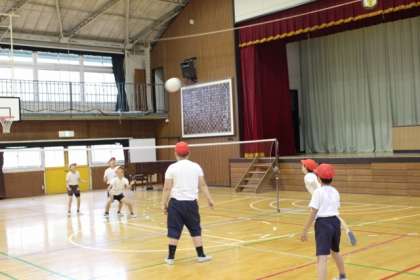 「キャッチバレーボールをやろう」です。チームを決めて、ゲームをしました。