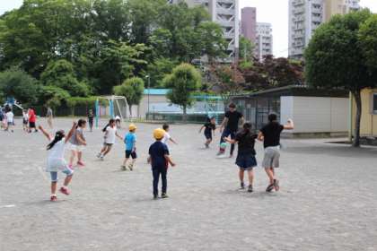 教育実習生がゲームでボールに当たり、子供たちが大喜び。