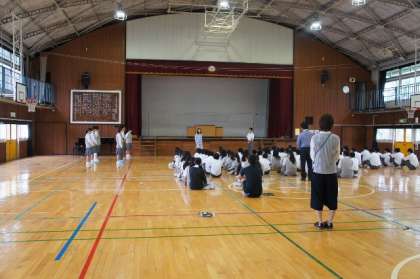 体育館にて行いました。小方先生への質問コーナーがありました。
