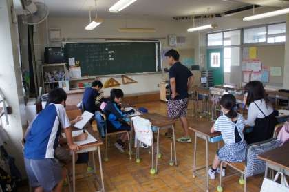 2つのクラスに分かれて学習しています。「分数のかけ算」(交換・結合・分配法則が成立するかを調べました)。