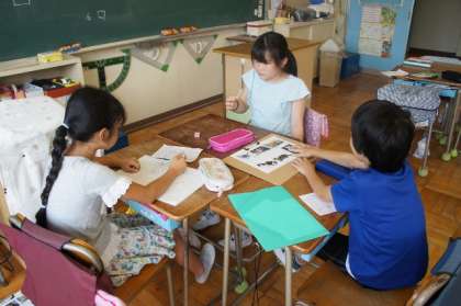 新聞づくりを進めています。「取材は終わりました」「アンケートは小3以上、先生方に行いました」との声あり。