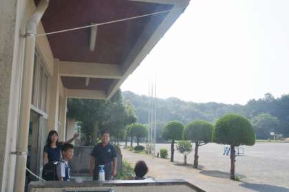 児童玄関前の打ち水とミストシャワーで子供たちを迎えました。