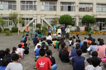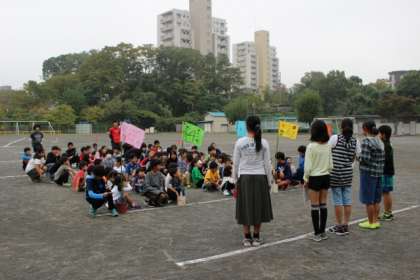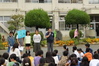 たてわり班ごとに整列、はじめの言葉、校長先生のお話でスタートです。