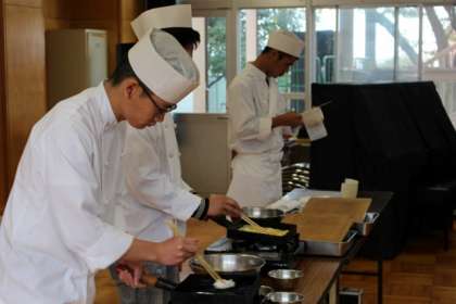地域連携室にて開催されました。調理師学校によるデモンストレーションの様子です。この後、吹奏楽部の演奏があります。