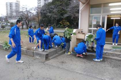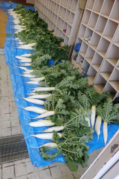 中学部2年生では、収穫した大根を「商品価値を高める」ために、冷たい水で洗って干しました。