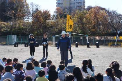風の強い日でしたので、校長先生より「風上・風下」のお話がありました。火の粉が飛んできたり、煙が流れてきたりするので、風上の方向に向かって避難しましょう。