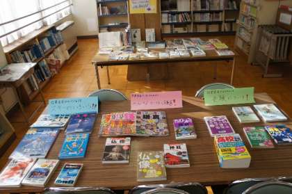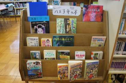 図書委員からのおすすめ(スキー、鎌倉、受験)コーナー。八王子コーナー。