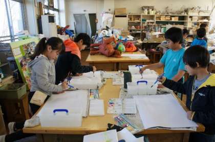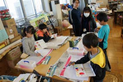 画用紙に水を吸わせます。夕やけをイメージして色をのせていきます。