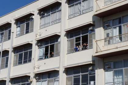 東京ウエストインターナショナルスクールとの交流会がスタート。10時バスが到着。3階からも手を振って。