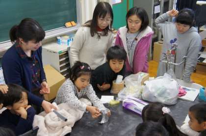 次は、「100人おどし」です。最後は暗室で「光る静電気」を見てみようです(こちらは写真はありません)。