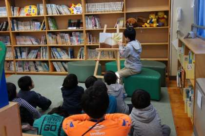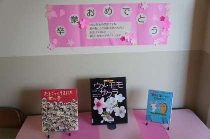 3月の図書コーナー。昼休みに本の読み聞かせをしてくれました。