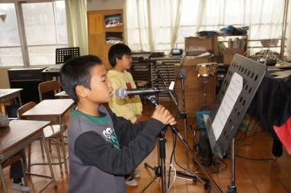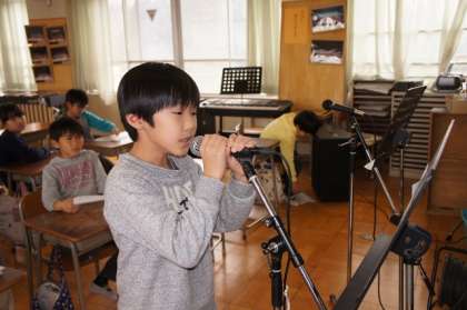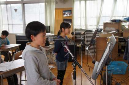 3年生がテストにのぞんでいます。マイクが用意されています。