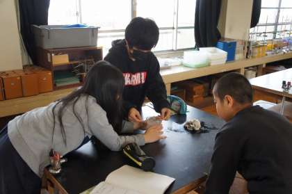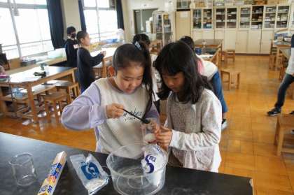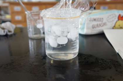 「水のゆくえ」の実験中。水を冷やした時の変化を観察しています。