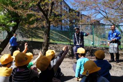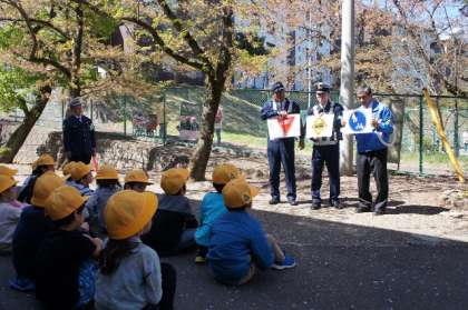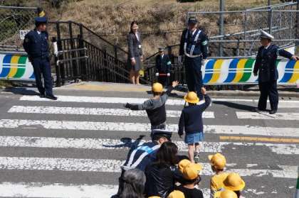 交通安全教室。高尾警察署の方から、横断歩道の渡り方、「右、左、右」の安全確認を教えていただきました。その後、実際に、横断歩道を渡りました。