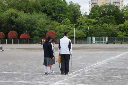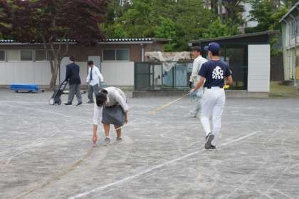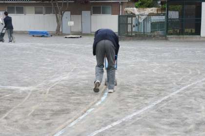 校庭のサッカーゴールを移動した後、基本のライン引きを行っています。お手伝いありがとうございます。