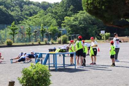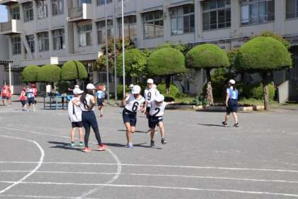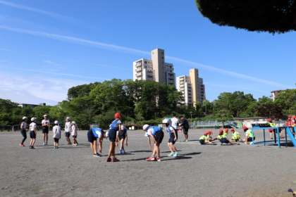 運動会選抜リレーの練習。準備運動した後、バトンパスの練習をしました。