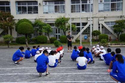小中合同選抜リレーの練習(2回目)を行いました。準備運動、反省会の様子です。