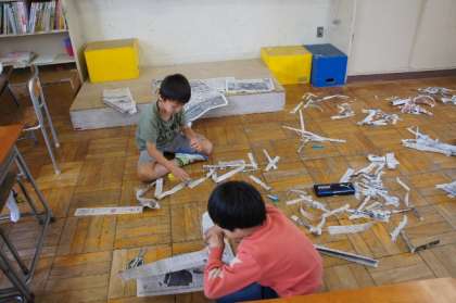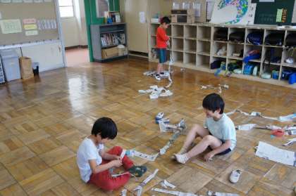 細長い紙をたくさん作って、ひみつきちを作っています。