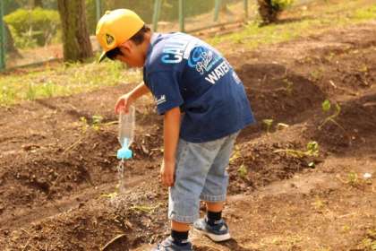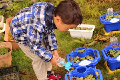 登校してすぐに、あさがおとサツマイモの苗にお水をあげています。
