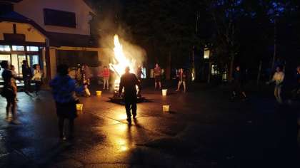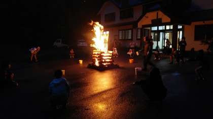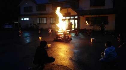 宿の前でキャンプファイヤー。ダンスとレクリエーションで盛り上がりました。