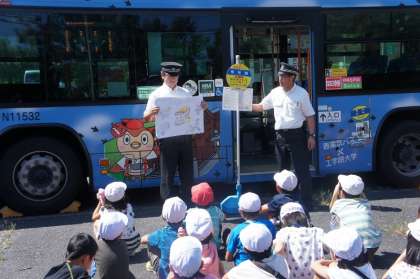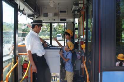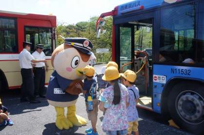 川町車庫で「バスの乗り方」を教えていただきました。「にしちゅん」とのふれあいもありました。3名の職員の皆様、たいへんにありがとうございました。