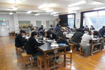 謎の物質Xが何なのか、実験結果を整理して班で話し合い、結論をホワイトボードにまとめています。この後、考察したことを他の班に発表します。