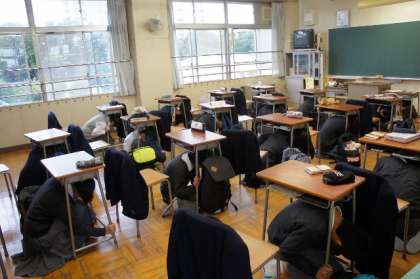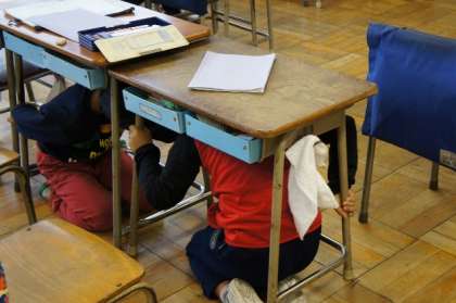 本校舎で、午前8時30分から「地震」の想定で実施しました。起震車体験時の「膝をつく」姿勢を確認しました。