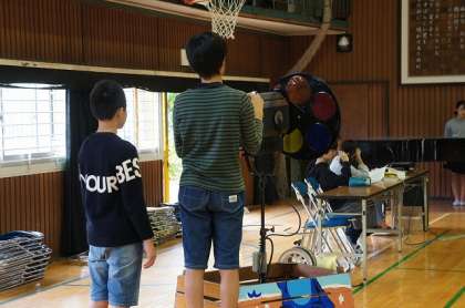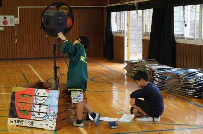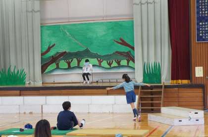 体育館で学芸会の練習です。係りの仕事も覚えています。
