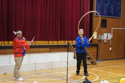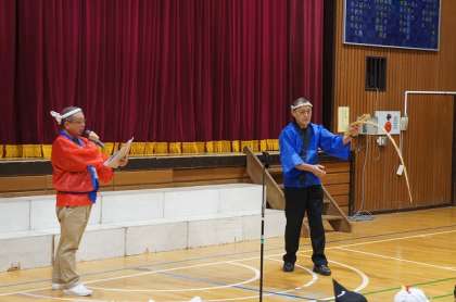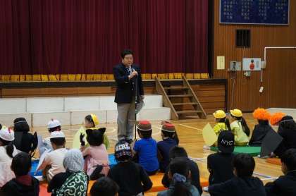 「校長先生のお話」地域の民生委員さんによる南京玉すだれの演技に拍手、ありがとうございました。