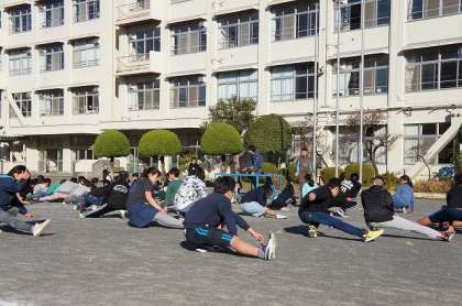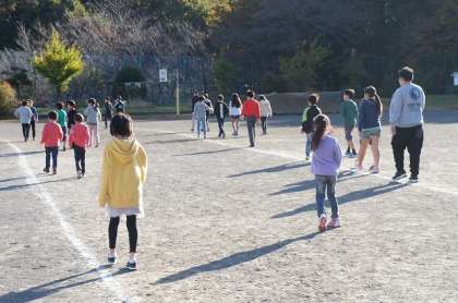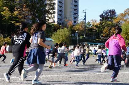 走った後は、1分間歩きます。続いて、整理運動。「手洗い、うがい」をして教室に入ります。